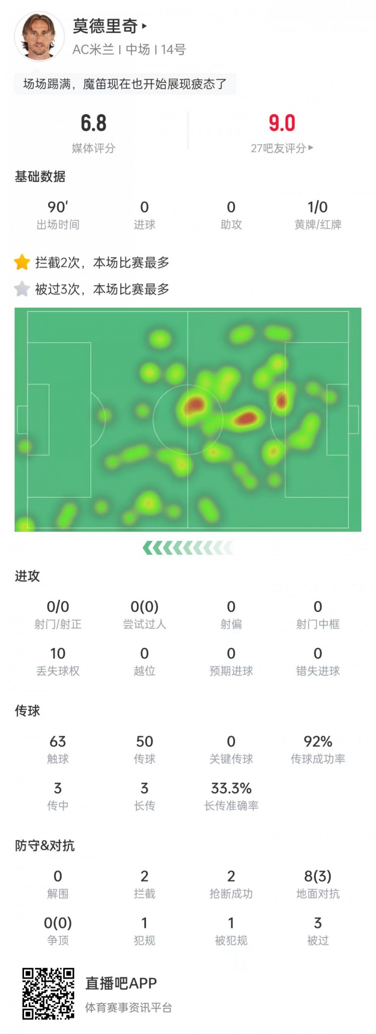 2025-10-29 08:21:27莫德里奇数据:射门+关键传球挂零,被过3次全场最多、评分6.8