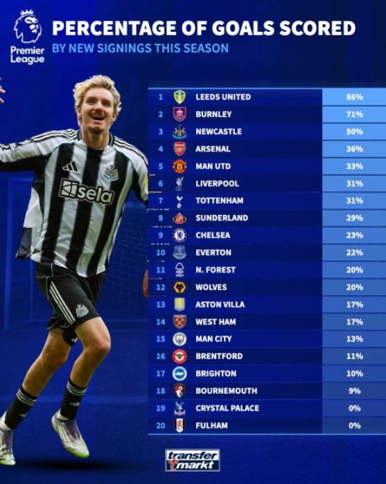 2025-10-10 00:02:30英超各队新援进球占球队总进球比例:利兹联86%最高,阿森纳第4