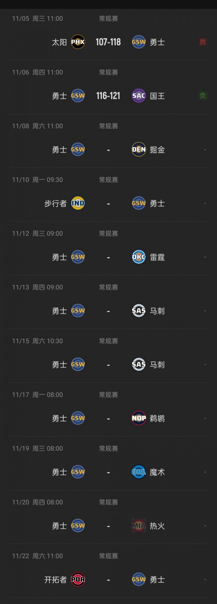 勇士在11月5日和6日背靠背对阵太阳和国王后,今天客战掘金。到22号对阵开拓者为止,他们还要打两个背靠背。