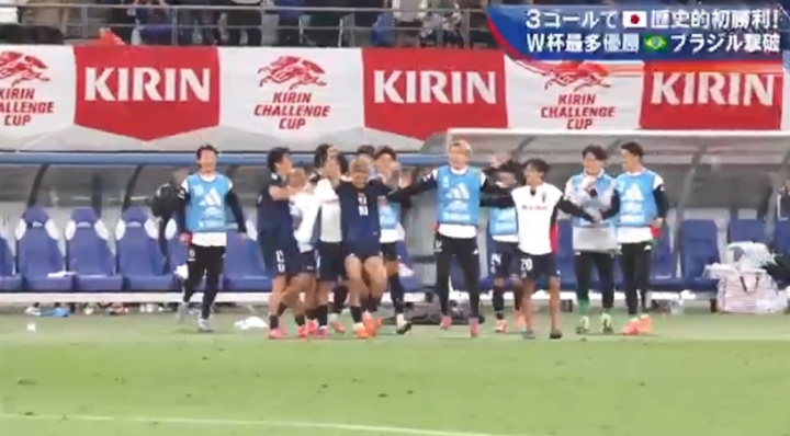 10月14日讯 麒麟杯国际友谊赛,日本主场让二追三逆转五星巴西,赛后日本替补席几乎全员冲入场内激情庆祝。这是他们历史首次击败巴西这一强敌。