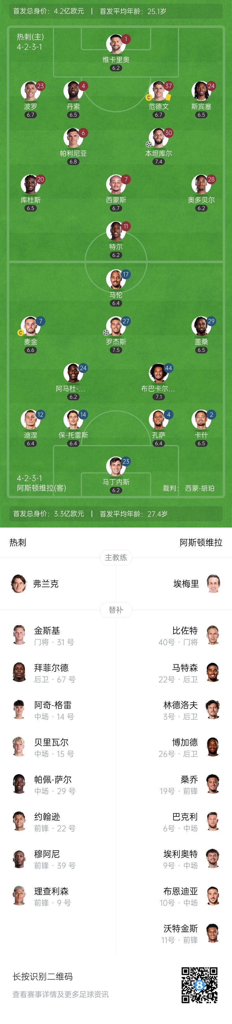 2025-10-20 00:12:06半场-热刺1-1维拉 本坦库尔破门库杜斯进球被吹 罗杰斯世界波扳平